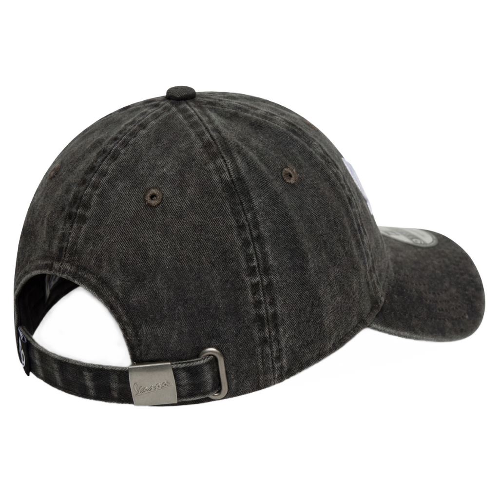 The Vespa by New Era 9TWENTY® cap delivers a relaxed vintage look with its heavy stone-wash treatment. Made from 100% cotton, it features the Vespa logo embroidered on the front, a white New Era logo on the side, and a Vespa V label on the back strap. The D-ring adjustable closure ensures a comfortable one-size fit.