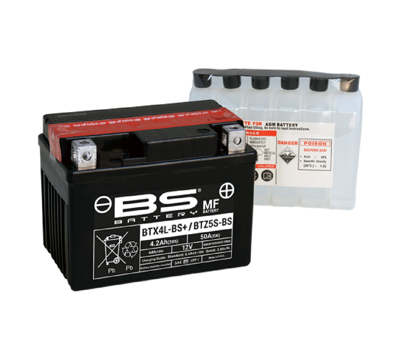 The BS Battery is a fantastic and well made product used by numerous manufacturers and retailers. Batteries are made for a variety of different models so it's encouraged to purchase the correct battery for your motorcycle or scooter. BTX4L-BS+/BTZ5S battery is a part of our MF range. Delivered with acid pack, this 12V 4.7Ah battery must be activated by filling the acid before first use. Totally sealed and maintenance free once activated, this battery offers high performances and doesn’t require water refilling.