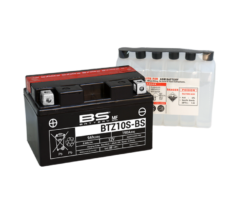 The BS Battery is a fantastic and well made product used by numerous manufacturers and retailers. Batteries are made for a variety of different models so it's encouraged to purchase the correct battery for your motorcycle or scooter. BTZ10S-BS battery is a part of our MF range. Delivered with acid pack, this 12V 8.4Ah battery must be activated by filling the acid before first use. Totally sealed and maintenance free once activated, this battery offers high performances and doesn’t require water refilling.